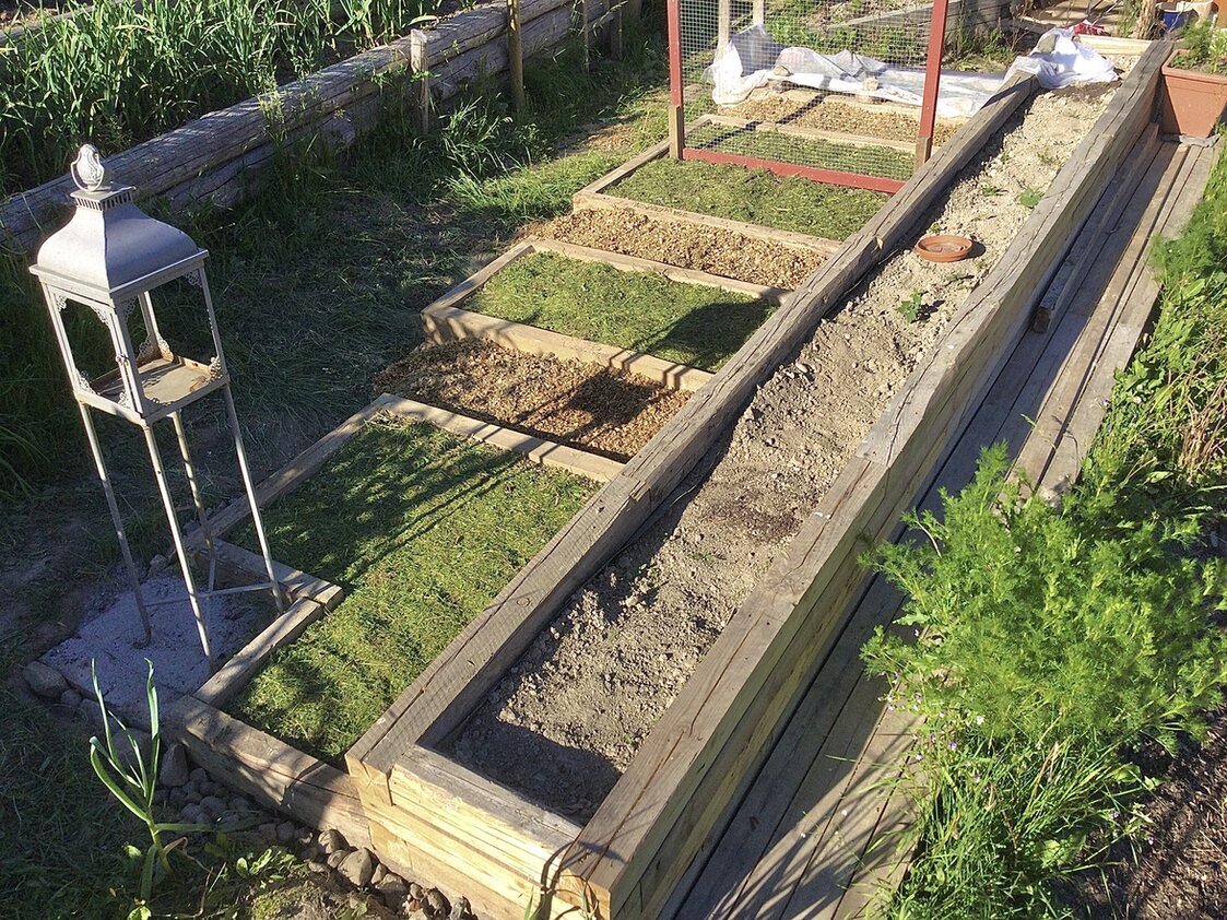 Mit dem Gedanken so viel wie möglich wieder zu verwenden, ist/war das Haus wirklich eine Goldgrube. Die Beete, die ich jetzt fertig angelegt habe, brauchten nur ein paar. schrauben und Nägel. Sonst nichts. Unter den früheren Fussbodenbalken habe ich Steine verlegt, die beim Abriss vom Schornstein übrich waren. Die Räume zwischen den Beeten sind mit Hobelspäne aufgefüllt, womit das Haus isoliert war.