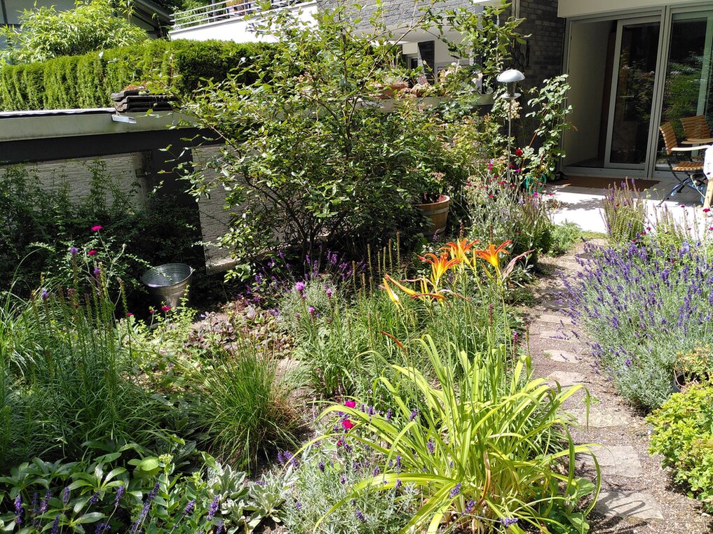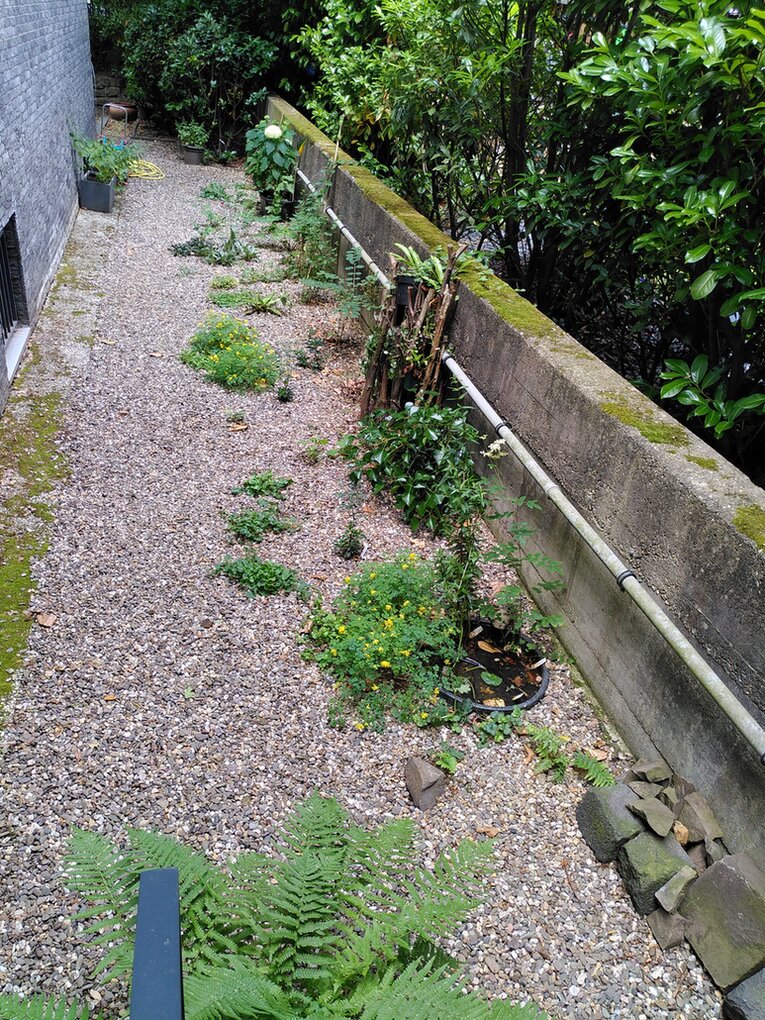 Wir haben das große Glück, dass zu unserer Erdgeschosswohnung (Hochparterre) ein 5x6m großes Gärtchen gehört. Dieses Gärtchen ist von einer anderthalb Meter hohen Mauer/Garagenwand eingefasst und von der Umgebung abgeschnitten, daher der Name. Das Gemeinschaftsgrundstück neben und hinter dem Haus ist nur durch eine (Nachbar-)Garage oder über unseren Garten zugänglich, mit einer ca. 30cm hohen Kiesschicht bedeckt und war uns ebenso wie die hässliche Betonmauer, auf der noch ein Abflussrohr verläuft, seit dem Einzug ein Dorn im Auge. Auf der Suche, wie das Ganze erst mal rein optisch aufzuwerten ist, bin ich im Hortus-Netzwerk gelandet und freue mich über die vielen Anregungen und Ideen, die ich hier schon gefunden habe: Es lässt sich auch ökologisch aufwerten!