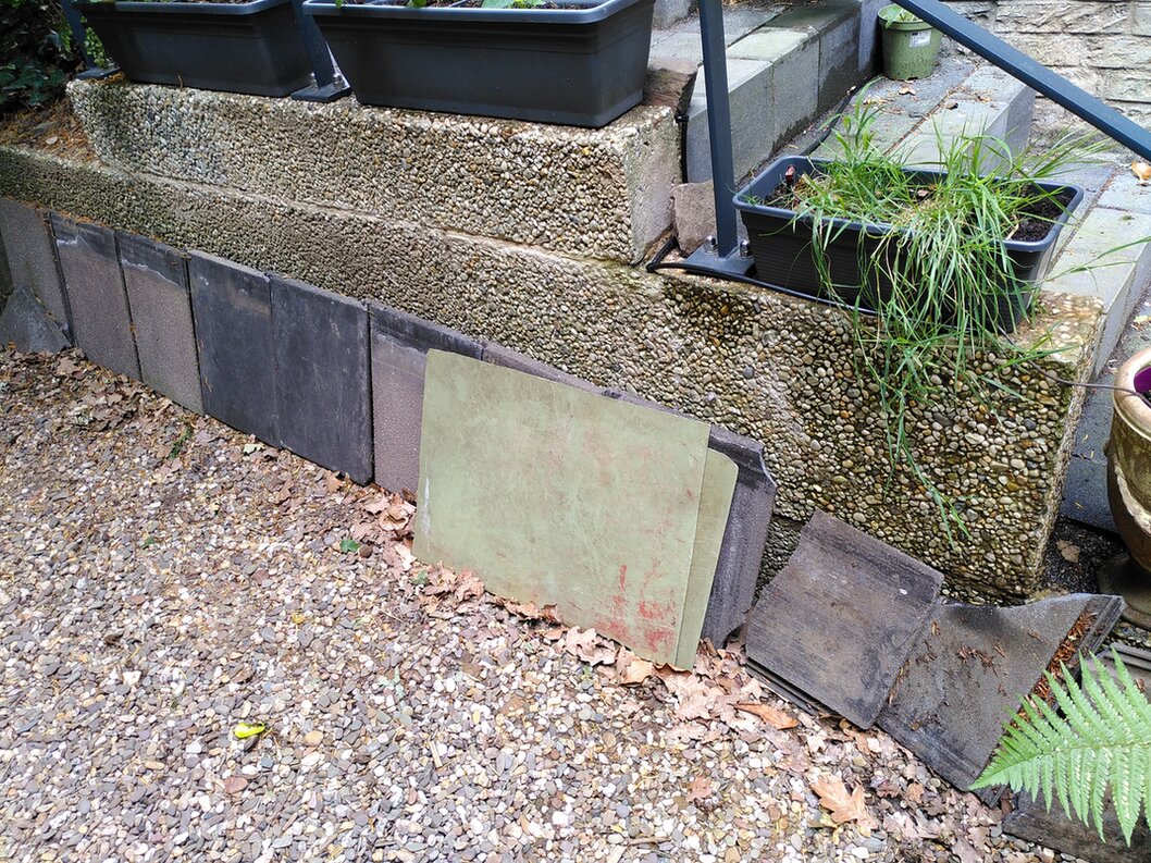Damit sie sich noch etwas sicherer fühlen kann, gibt es nun einen Dachpfannentunnel vom Strauchefeu zum Sumpfbeet. Für eine Steinpyramide hat es zwar weder genug Platz noch genug Steine, aber für eine kleine Krötenhöhle reicht es.