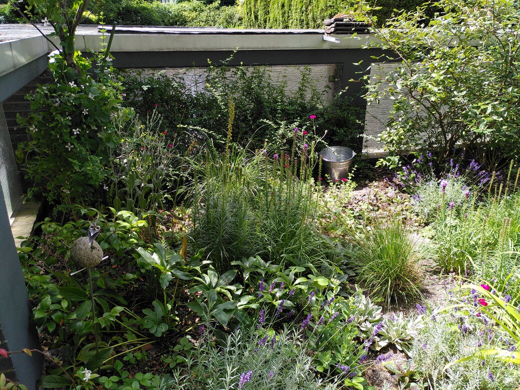 Pufferzone: Eibe, Osterschneeball (die Meisen brauchen ihn als Rückzugsort, wenn sie die Körner aus dem Futtersilo in Ruhe knacken wollen), Ginster, Himmelsbambus, Choisya ternata, Osmanthus im Kübel als Sichtschutz auf der Mauer, eine Felsenbirne als Baum - leider vieles nicht hiesig.