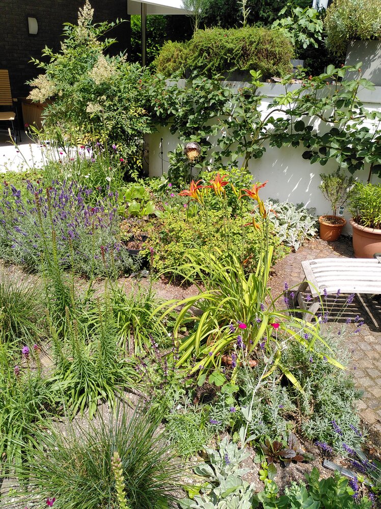 Hotspot: Lavendel, Prachtscharten, Glockenblumen, Storchschnabel, Bergenien, Wollziest, Helleborus orientalis, Fingerhut, Buschwindröschen, Hohler Lerchensporn, Lungenkraut, Vergissmeinnicht, Schneeglöckchen, Traubenhyazinthen, Krokus, Küchenschelle, Steppensalbei, Taglilie, Frauenmantel, Sedumsorten, eine kleine Clematis am Stamm der Felsenbirne, Sedum Telephium, Teppich-Aster, Winterjasmin, Phlox...