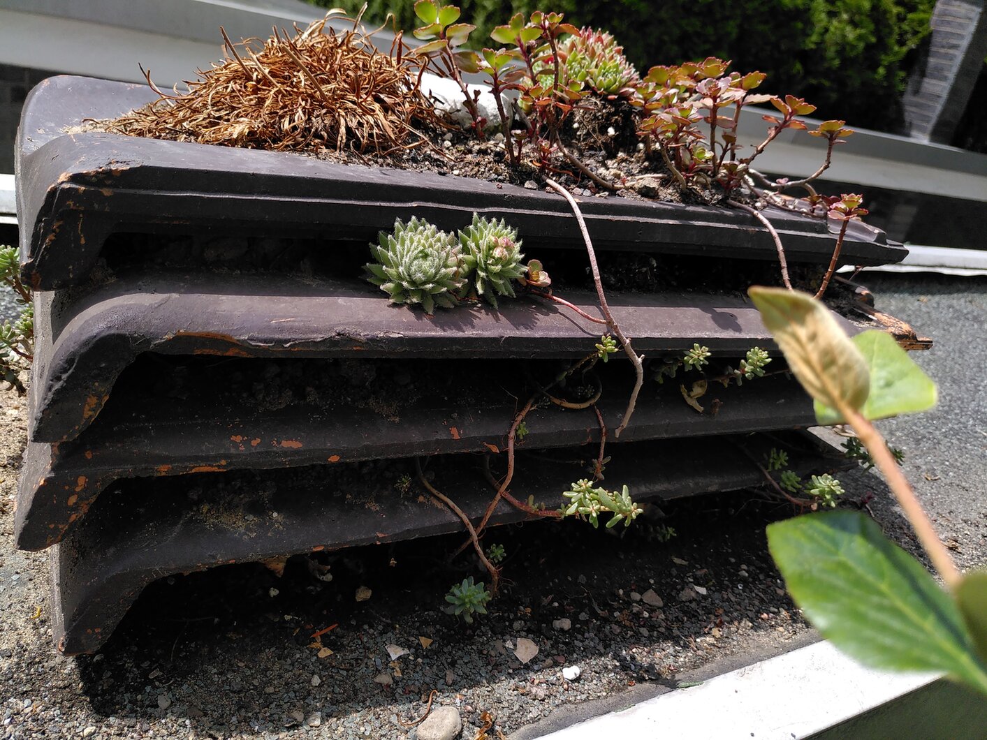 Begonnen hat unsere Umgestaltung mit einer Treppe, die nun vom höhergelegenen Garten nach unten zum Seitenstreifen neben dem Haus führt. Diesen haben wir im Frühjahr mit Zustimmung der übrigen Hausbewohner bepflanzt. Wir pflegen quasi zwei Gärten auf unterschiedlichem Niveau, deshalb unterteile ich meine Beschreibung. Der Kiesstreifen ist von vornherein als Hortus geplant - der schon vorhandene Terrassengarten enthält auch viele "exotische" Pflanzen. Seit diesem Jahr haben wir dort aber nauch Krötenbesuch: Bufo bufo ist sportlich und kommt über unsere neue Treppe zu uns herauf! Sie hat bestimmt auch unser erstes Naturmodul genutzt, das mein Mann eher zufällig "angelegt" hat: einen Tunnel aus alten Dachziegeln, die seit den letzten Dacharbeiten im Kiesbeet an die schattige Mauer angelehnt stehen.