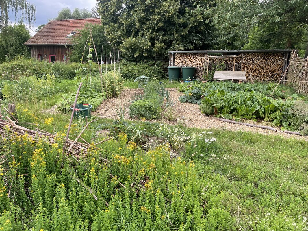 Gibt es jetzt vier: Einen alten Gemüsegarten, den kleinen Waldgarten, eine kleine Streuobstwiese und eine neue Ertragszone (Gemüsegarten), die wir dieses Frühjahr angelegt haben. Sie grenzt an einer Seite an Holzstapel an zwei Seiten an Bach und Knick am Teich des Nachbarn und an einer zur Streuobstwiese, hier kommt im Herbst noch eine kleine Pufferzone aus niedrigen Sträuchern zur Wiese.