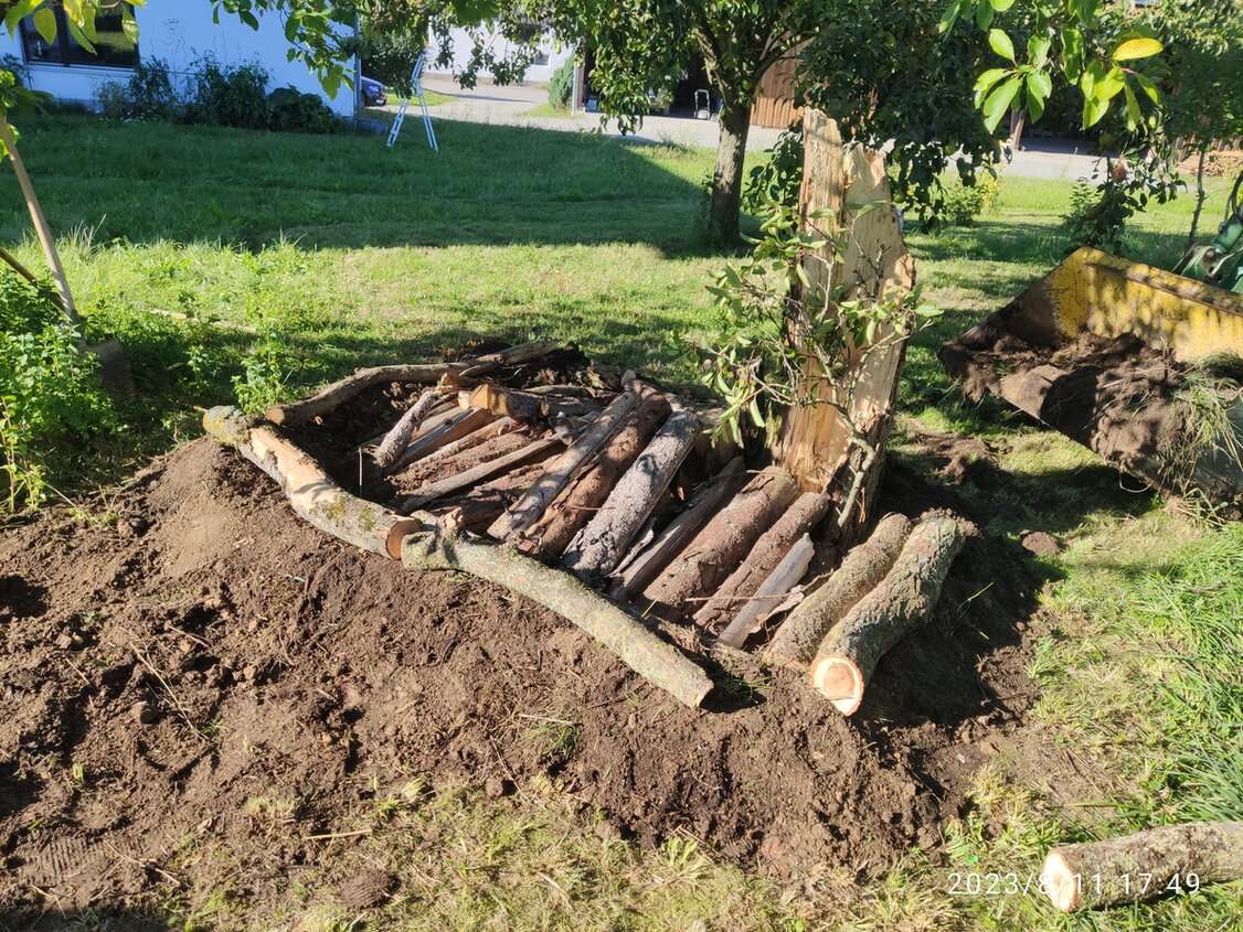 Dazu schichtet man in dem ausgehoben Loch/ Keller einfach angefangen von Holzspänen/ Holzmehl/ Holzhäksel, Äste, Holzscheite, Rinde, Wurzeln liegend und stehend alles übereinander, wobei die größeren und schwereren Hölzer obenauf gelegt werden. Dadurch gewährleistet man unterschiedliche Zerfallstadien...