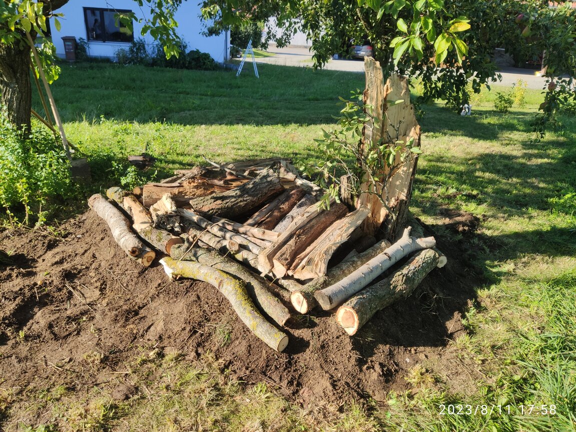 Ohne Keller dauert es deutlich länger in einem frisch angelegtem Totholzhaufen bis er von Käfern genutzt wird. Der Lebensraum warmer (!) Holzmulm ist immens wichtig und der ist in den meisten Gärten Mangelware.