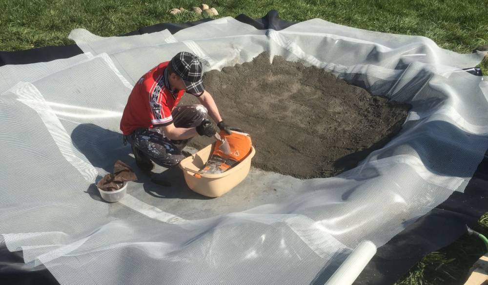 Auf dem Schutzvlies wird die Teichfolie (am besten EPDM) ausgebreitet. Auf die Folie kommt als Betonierungshilfe ein Armierungsgewebe (weiß im Bild). Dann kann der Fertigbeton vorbereitet werden. An diesem Tag haben wir gelernt: es gibt den “normalen” Fertigbeton, bei dem man den Sackinhalt mit Wasser mischt; und es gibt…