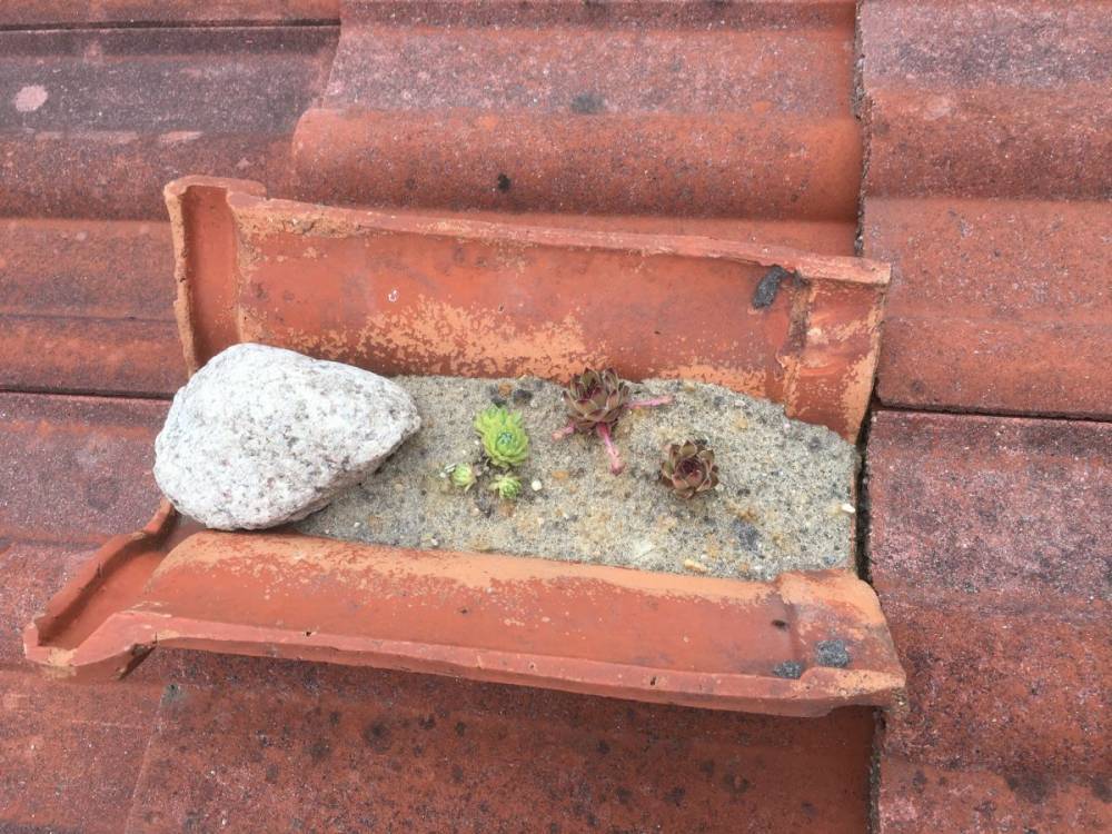 Zwei mit Hauswurz belegte Firstpfannen dekorieren das Dach.