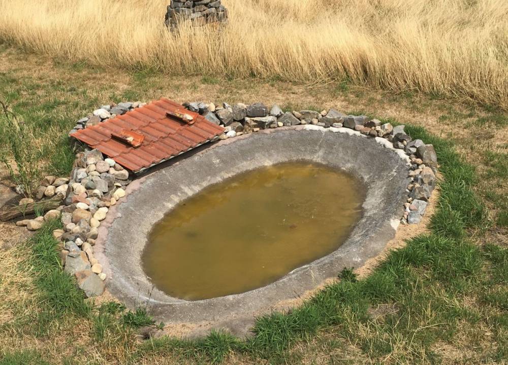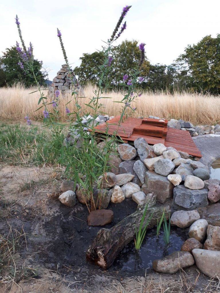 Anders sieht es aus, wenn man eine kleine Wasserstelle anlegt, die trockenfallen darf. Da reichen die eigenen Lehmbaukünste dann ja auf jeden Fall aus.