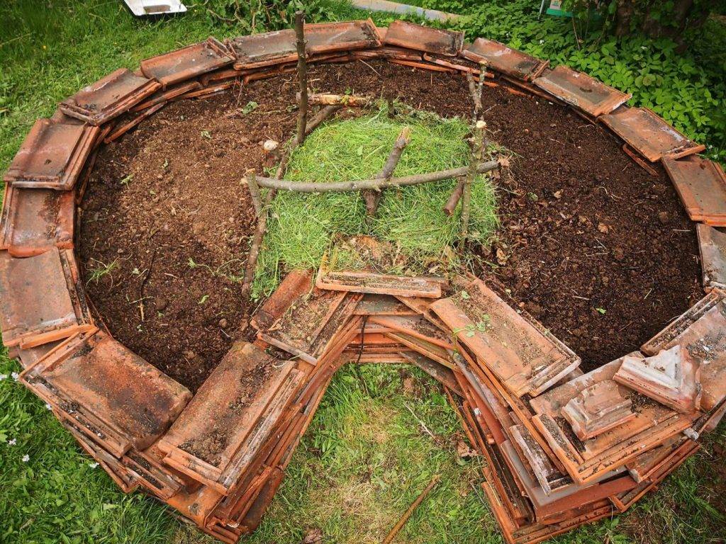 Alte Dachziegel auslegen und Kompost Fläche markieren.