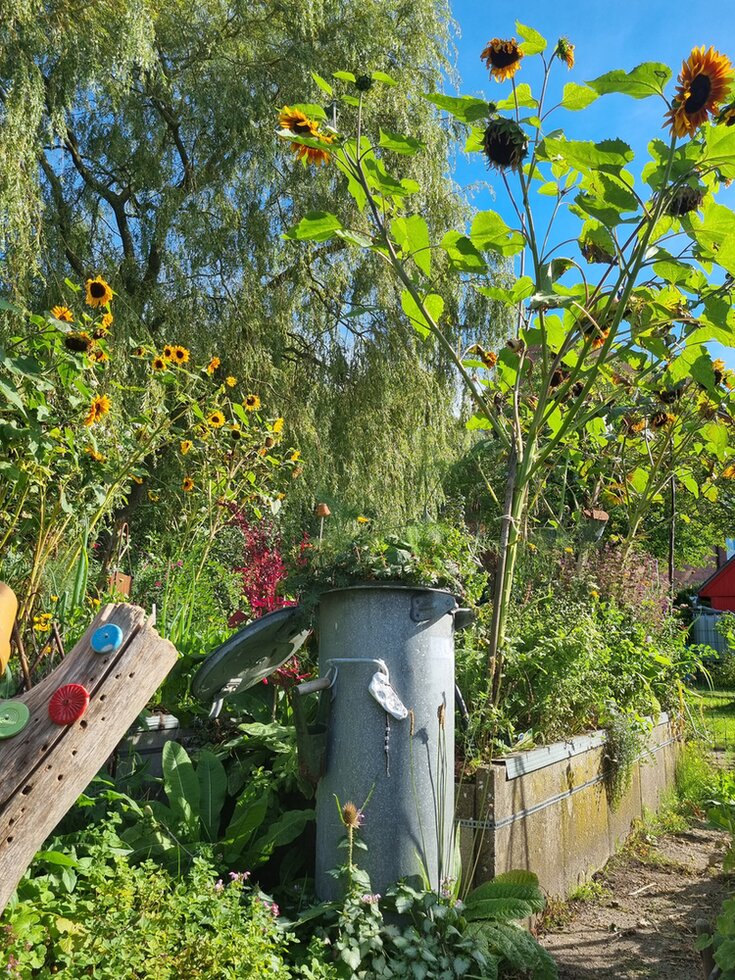 In den Hochbeeten wächst eine wilde Mischung aus Gemüse, Kräuter und Blumen.