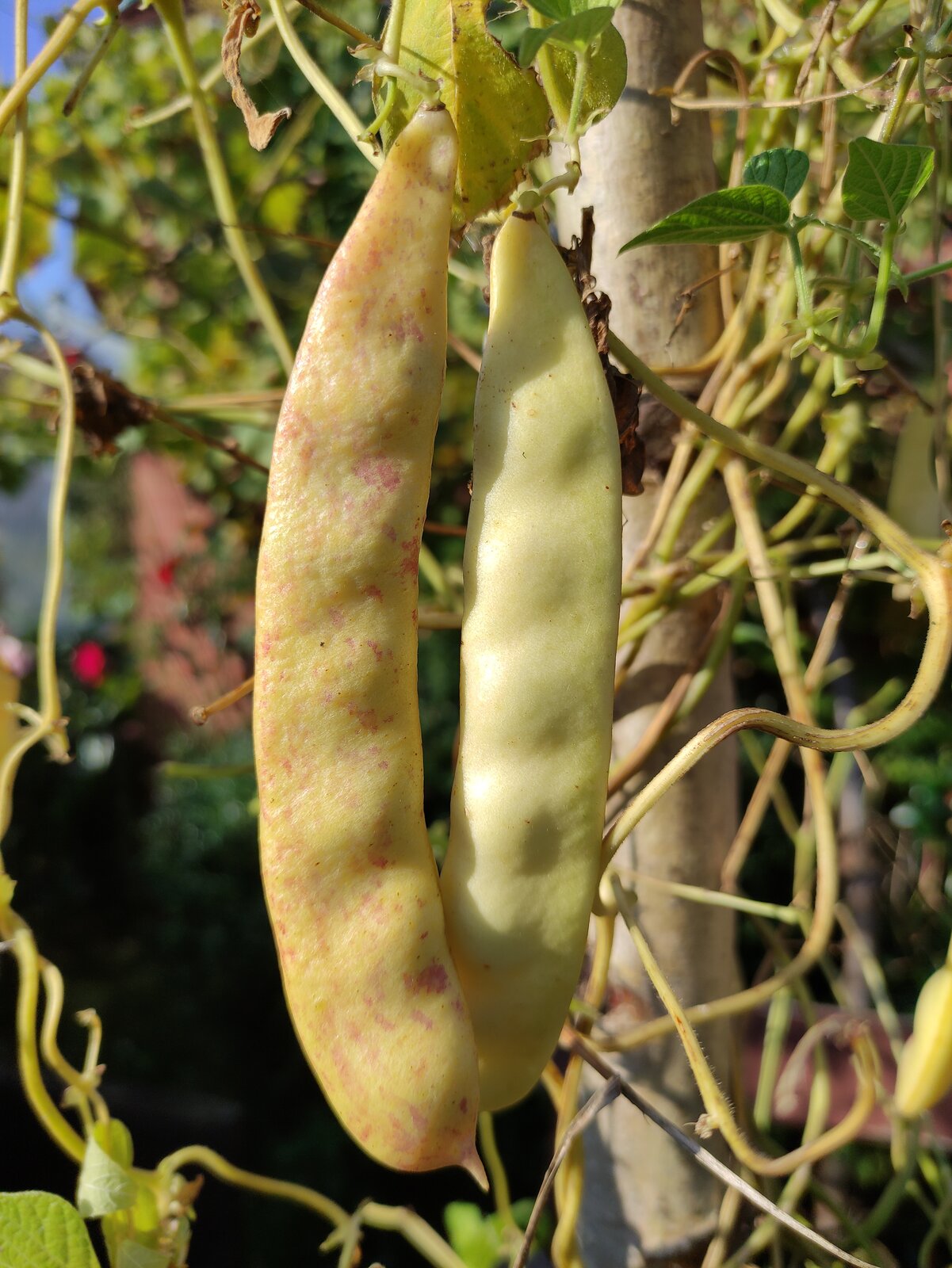 Die bulgarischen Stangenbohnen sind jetzt, nach riesiger Ernte, langsam am Ende. Die letzten Bohnen dürfen bis zur Samenreife hängen bleiben. Pünktlich zum Ende der einen legt jetzt die gelbe türkische Stangenbohne und die Julifreude nach.