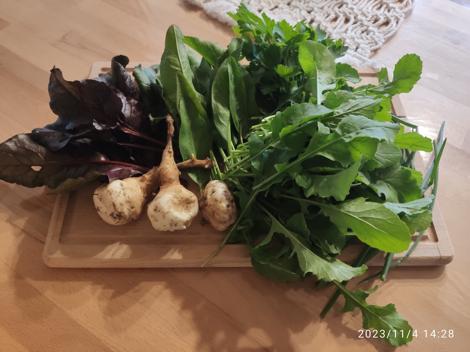 Der Rukola, die Senfkresse, Zwiebellauch, Blätter von Rote Beete und Petersilie ergaben heute einen leckeren Salat. Dazu ein paar Topinambur, Tomaten und Inka- Gurken....wow!