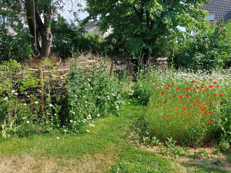 Meine Hotspot-Zone ist mein ganzer Stolz und hier steckt auch am meisten Arbeit und Herzblut drin. Ich habe ein kleines Sandarium angelegt, 3 große Magerbeete geschaffen ( tonnenweise Kalkschotter und Sand aus dem örtlichen Steinbruch ), eine Wildblumenwiese ausgesät, ein Sumpfbeet unter der Regenrinne unseres Anbaus gebuddelt und bepflanzt, zwei Wildbienen-Nisthilfen aus alten Hölzern gebohrt, einen Käferkeller gegraben, eine große Totholzhecke unter der alten Pflaume angelegt und mit "wärmeliebendem Saum" davor bepflanzt, 3 große Reisighaufen angelegt, ein Waldbeet mit stehendem und liegendem Totholz kreiert, dem Nachbarn eine riesige Wurzel abgeschwatzt und diese in eines der Magerbeete integriert, 4 verschiedene Komposthaufen (ich war vorher schon ein großer Kompostfan), diverse Steinmäuerchen und Steinhaufen angelegt und diverse Nützlingsunterkünfte geschaffen ( markige Stengel aufgehängt, Hummelnest nach Markus Gastl´s Anleitung gebaut, umgedrehte Blumentöpfe mit Holzwolle auf Pfählen, etc.). Meinen Naturteich habe ich schon vor 20 Jahren angelegt und immer ohne jegliche Technik, Strom und Chemie gesund gehalten. Dem habe ich allerdings mit ein paar zusätzlichen heimischen Pflanzen ein ordentliches Upgrade verpasst. Immer mal wieder Unken und Frösche sind gern gesehene Gäste, Libellenlarven vieler verschiedener Arten und Molche wohnen hier schon immer.