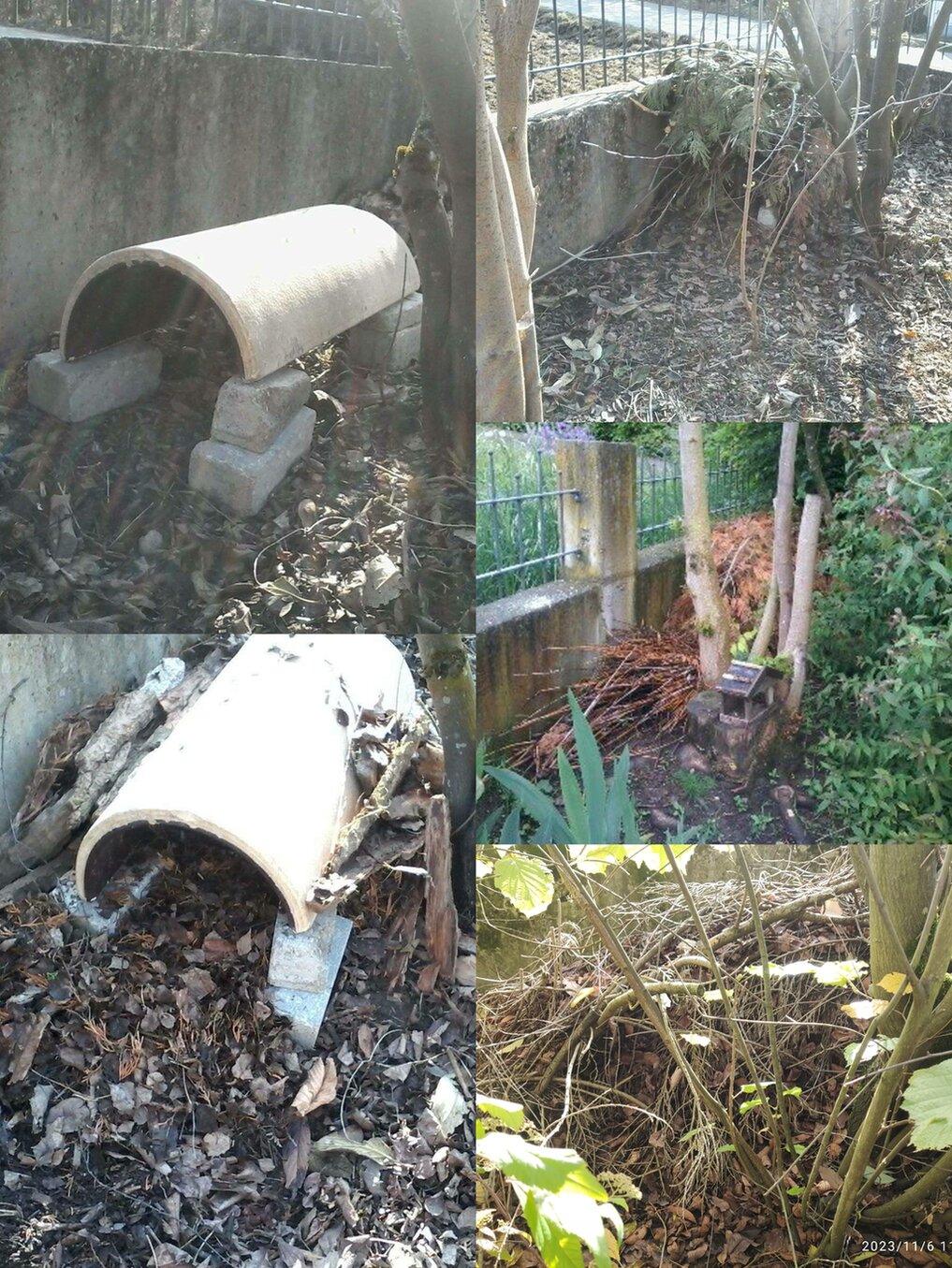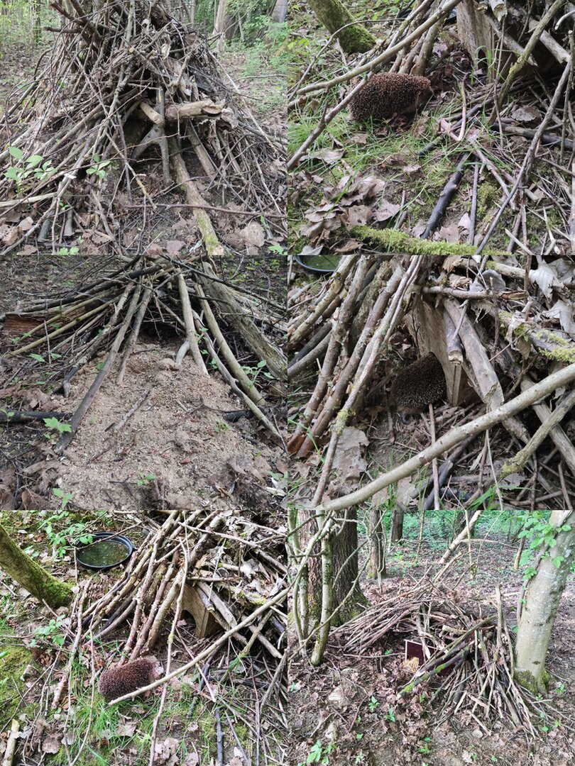 Verschiedene Asthaufen...immer mit Zugang zu einer im Inneren sich befindlichen Höhle oder Igelhäuser.