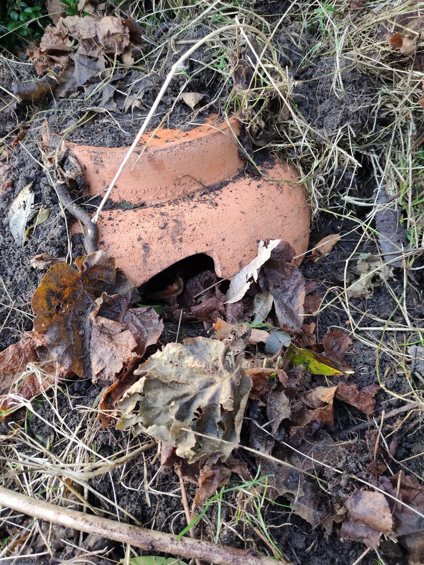 Dann wird der Topf oder Schale zur Häfte schräg in den Boden eingegraben und mit Laub oder Moos befüllt.