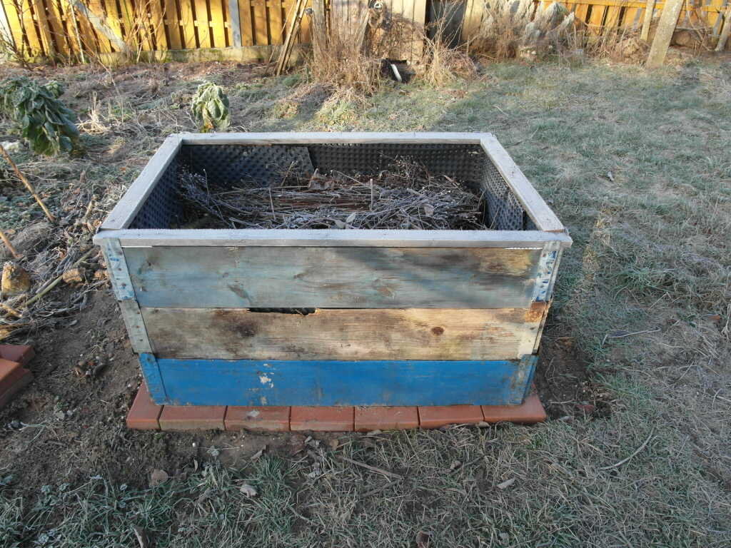 Oder doch von 'Müll' profitieren? Mein Hochbeet besteht aus ausrangierten Palettenrahmen mit Deltafolie aus Baustellenabfall.