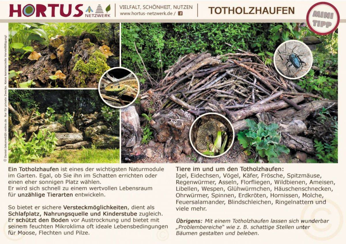 Übrigens: mit einem Totholzhaufen lassen sich wunderbar “Problembereiche” wie z.B. schattige Stellen unter Bäumen gestalten und beleben.