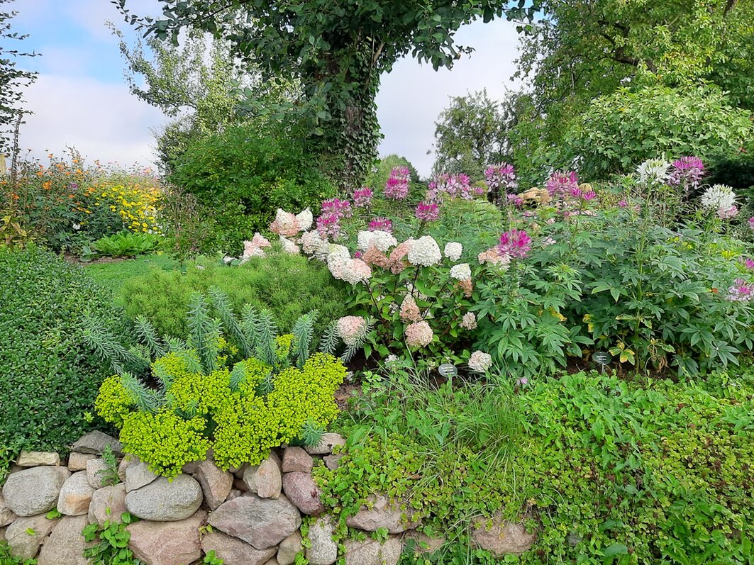 500 lfd. Meter Wildhecken, 100 lfd. Meter formale Eibenheken, 200 lfd. Meter Trockennmauern, alte Streuobstwiese mit historischen Sorten u.s.w. - über Allem steht der Begriff "Vielfalt" für uns.
