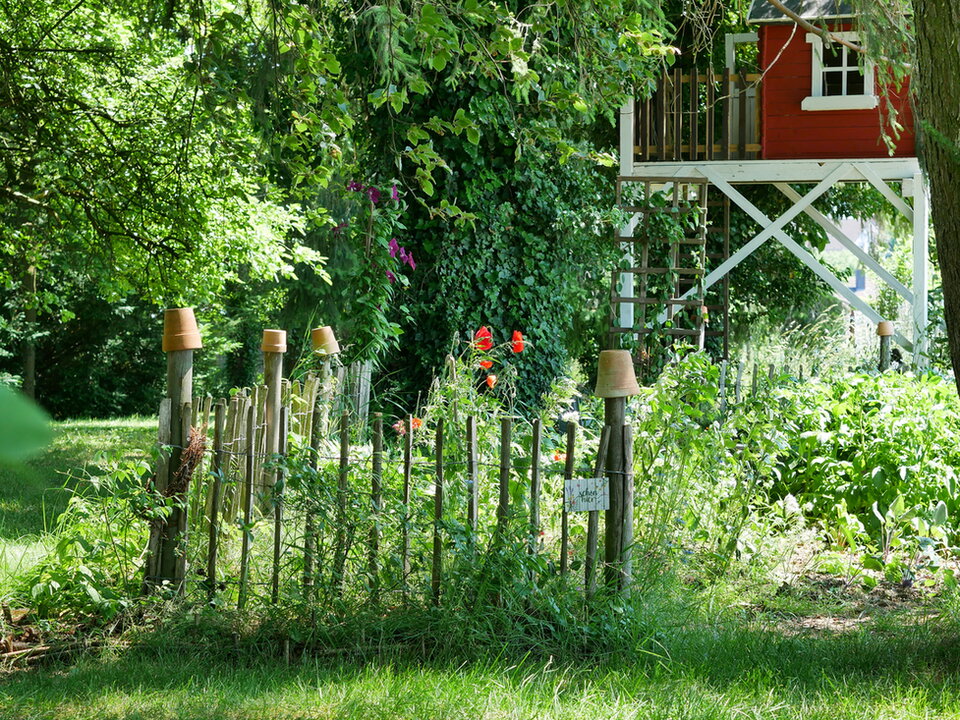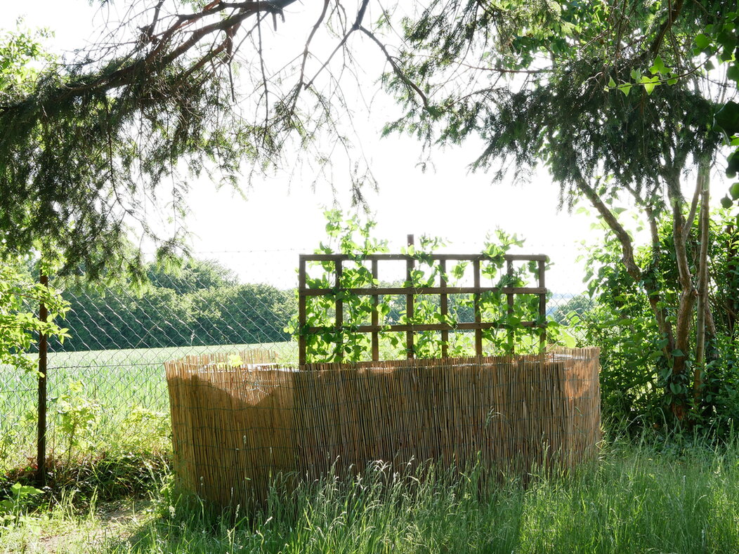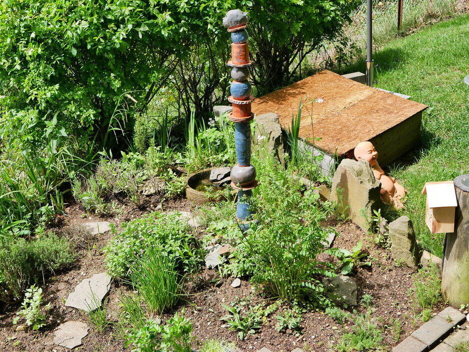 Außerdem wurde sie mit einer Vielzahl von Naturmodulen angereichert, die das Leben und die Vielfalt fördern. Ein mit Farnen bepflanzter Käferkeller mit Totholzelementen, Reisighaufen, Kompost, großer Laubkompost und Igelunterkünfte in Form von Reisighaufen mit einer Höhle aus Pflastersteinen im Kern und durchlässige Stellen im Maschendrahtzaun schaffen Verbindungen und Lebensräume für eine Vielzahl von Tieren und Insekten. Kurze Benjeshecken geben dem Garten so langsam mehr Struktur.