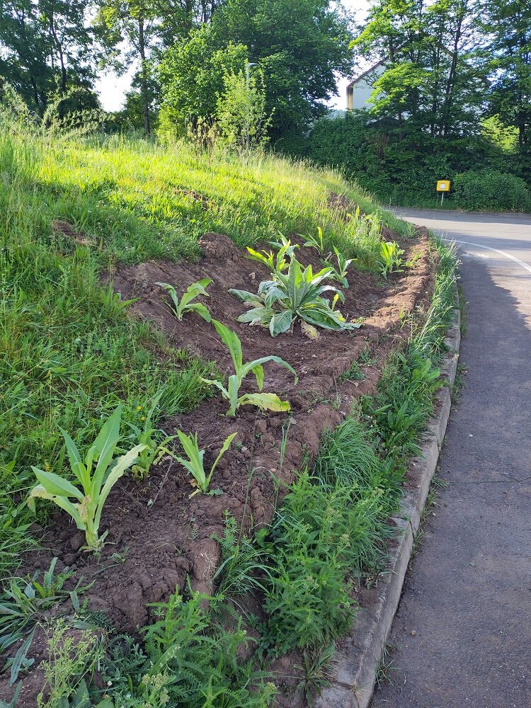 Hier haben wir erstmal v.a. Kardendisteln und Königskerzen gesetzt, die sich in unserem Privatgarten schon angesiedelt und ausgebreitet hatten, mit schönem Erfolg.