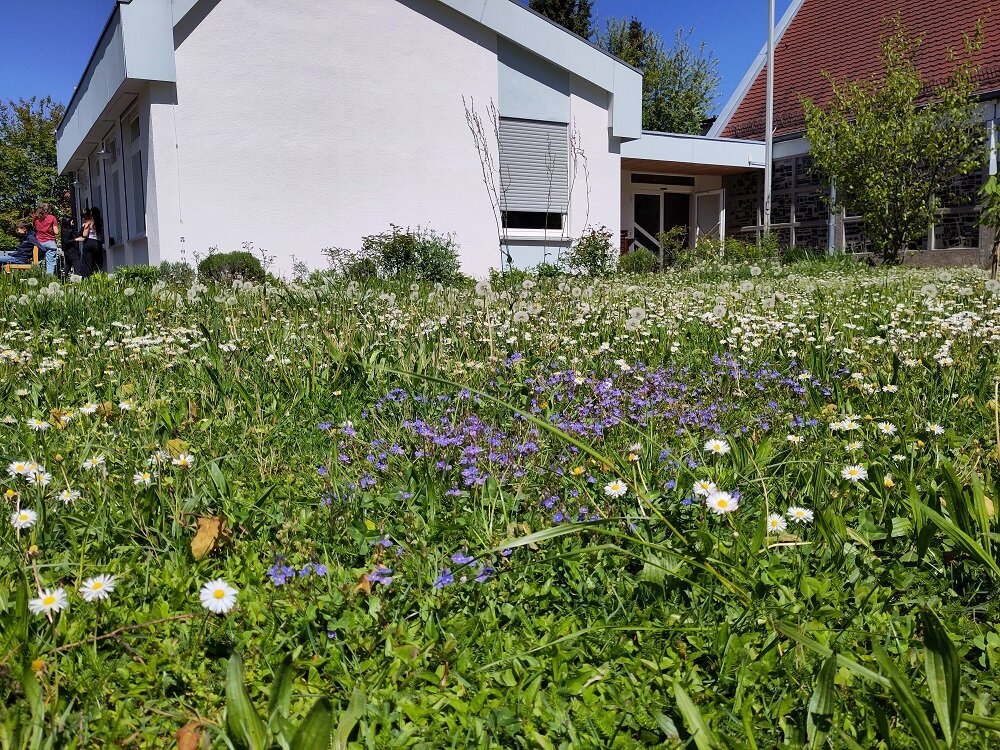Auch die ebene Rasenfläche vor dem eigentlichen Hortus wurde erst spät gemäht und auch hier entwickelten sich erstaunlich viele heimische Kräuter und Blumen. Wahrscheinlich hat es sich im Nachhinein als Glück erwiesen, dass die gesamte Wiesenfläche viele Jahre lang von einem sehr fleißigen Hausmeister sehr kurzgehalten und das Mähgut entfernt wurde - dadurch ist sie ganz von selbst richtiggehend ausgemagert.