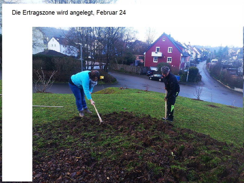 Im Februar 2024 steckten wir zunächst die Ertragszone (ca 18 qm) ab. Wir lockerten die Erde mit der Doppelgrabgabel und füllten Schafsmist und Häckselschnitt (von den Sträuchern hinter der Kirche) auf, um eine gute Humusschicht zu erreichen. Nun wartet das Beet nur noch auf die vorgezogenen Gemüsepflanzen, die schon in diesem Herbst unser „Erntedankessen“ bereichern sollen.