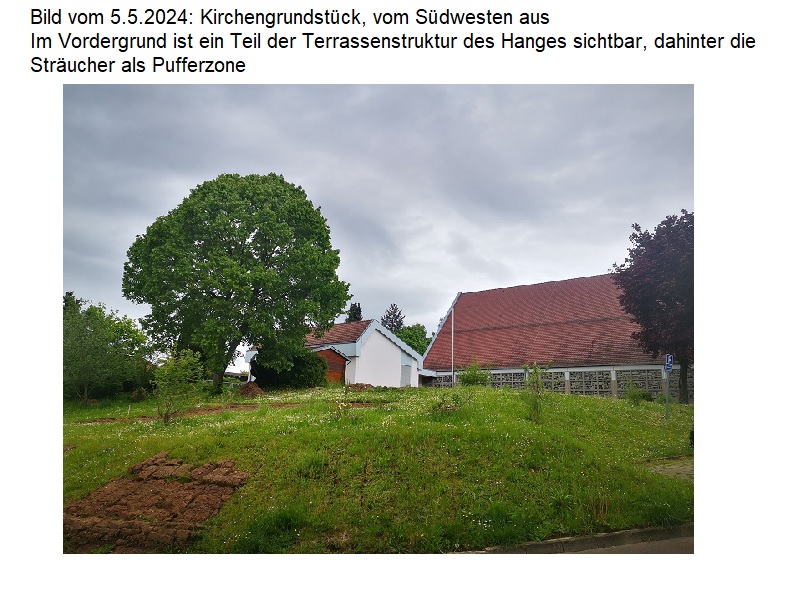 Die uns zur Verfügung stehende Fläche ist allerdings im Norden und Osten durch das Kirchengebäude und das anschließende Gemeindehaus begrenzt. Außerdem muss ein Teil der Rasenfläche für Feste der Kirchengemeinde frei gehalten werden. Es steht uns allerdings noch immer genug Fläche zur Verfügung (610 qm), um einen Hortus anzulegen.