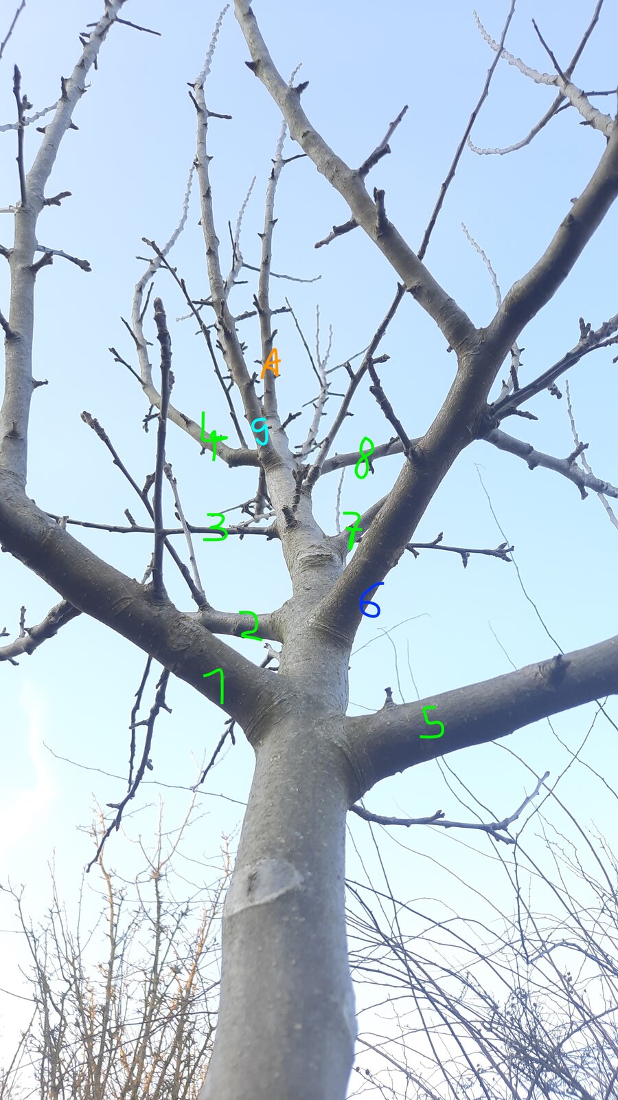 Ich habe die Äste nummeriert. Blickrichtung des Bildes ist Norden, also sehen wir die Südseite des Baumes.