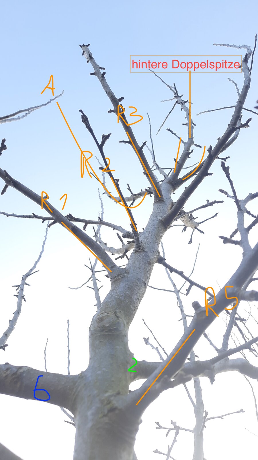 Die 2 am Stamm auf Astring entfernen, die 6 sollte auch weg, ist aber schon etwas zu stark.