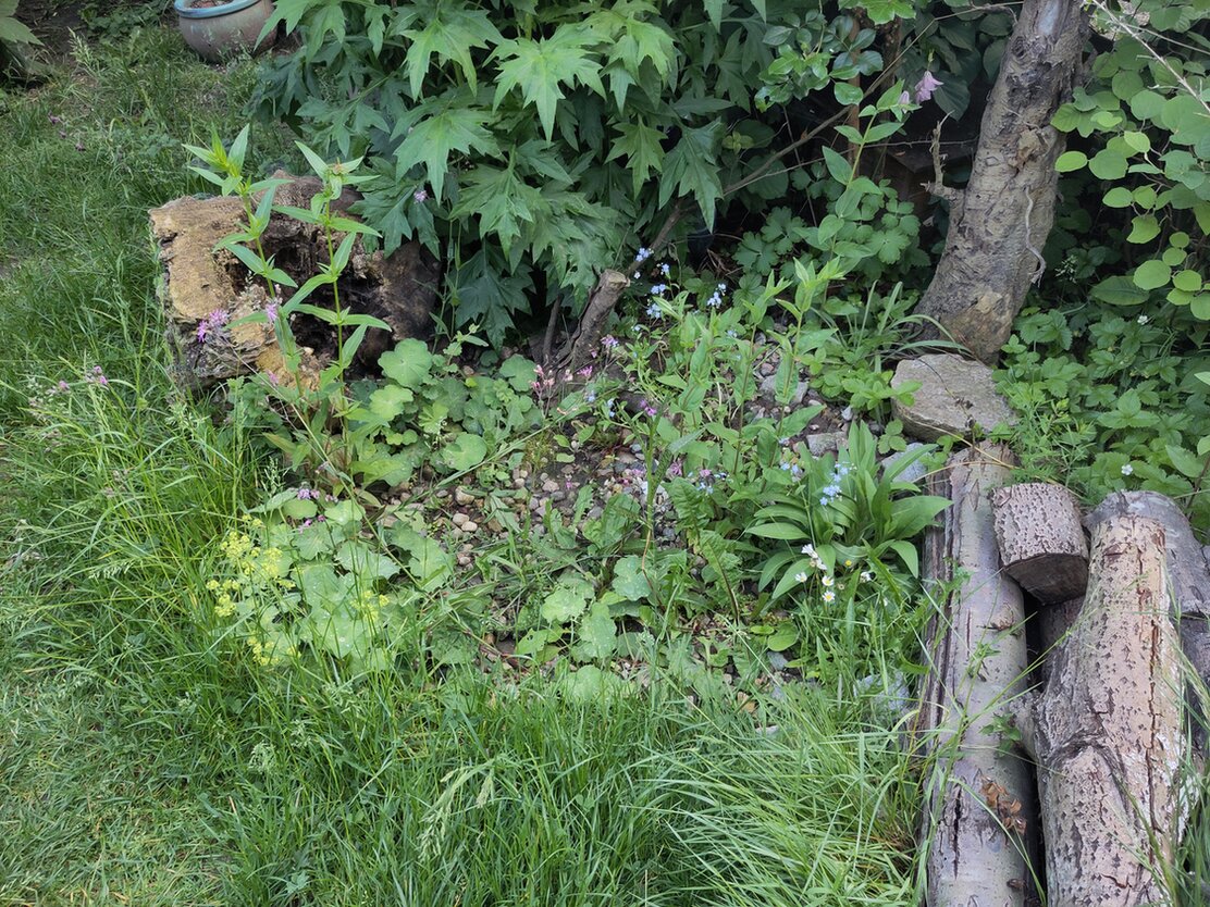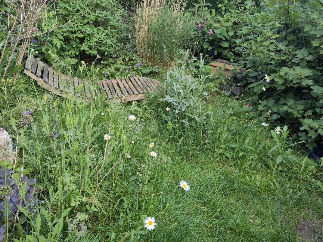 An mehreren Stellen im Garten liegen Totholzelemente. Der Rest der ehemaligen Rasenfläche ist zu einer Blumenwiese geworden, deren Ausmaß ich mit einer Handsichel begrenzen. Den Rasenmäher habe ich seit zwei Jahren nicht mehr benutzt.
