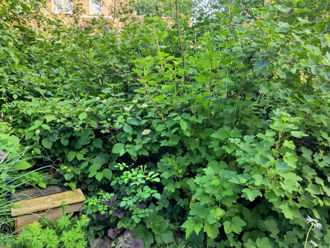 Die Südgrenze des Gartens besteht aus Johannisbeere und Stauden wie Nesselkönig, Nesselblättriger Glockenblume und einem Recht großem Totholzhaufen, welcher hinter dem eigentlichen Grundstück die Begrenzung bildet.