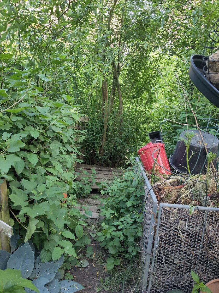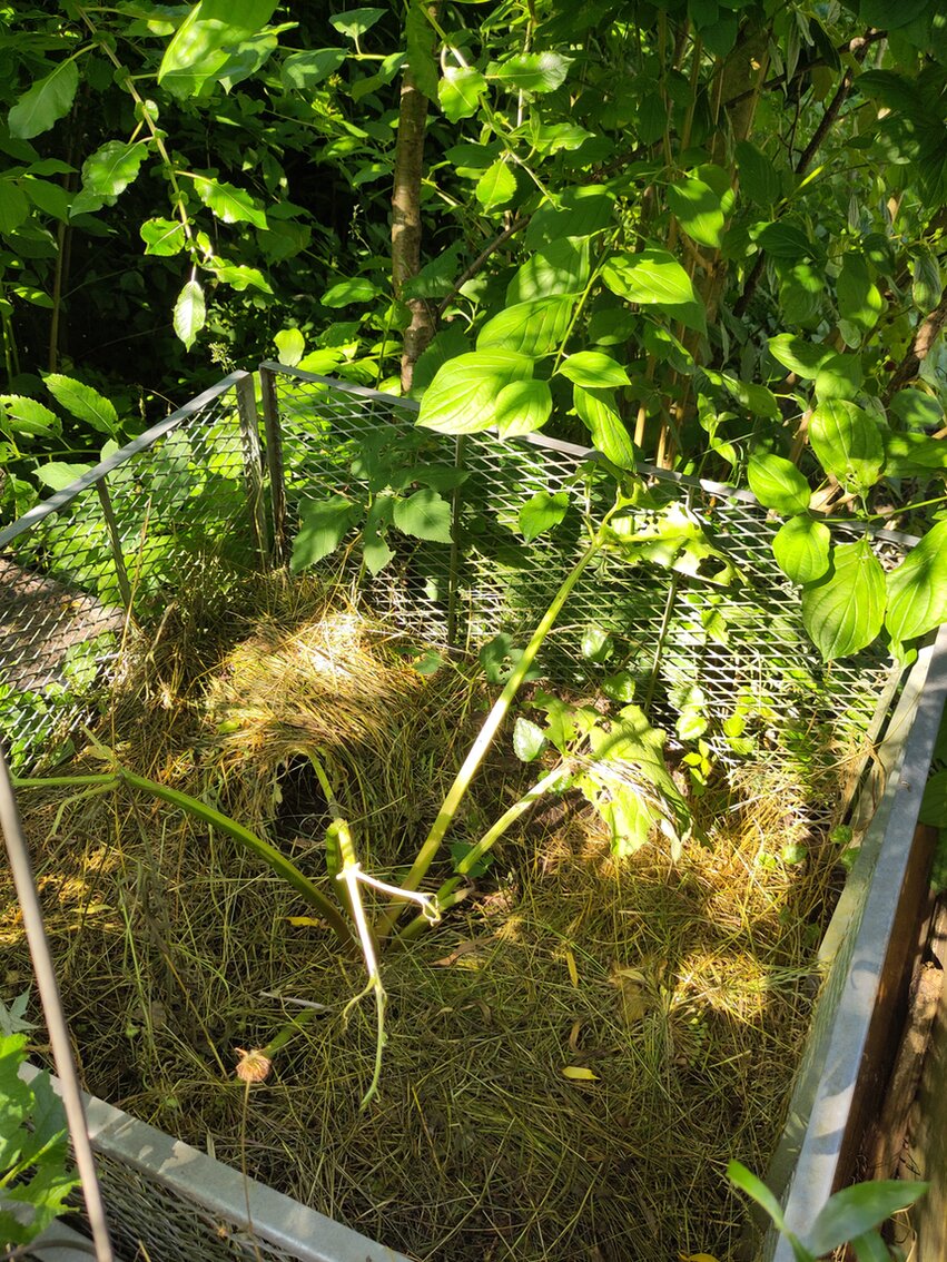 Das eigentliche Ende des Grundstücks verschwindet zwischen Hochbeet und den zwei Komposthaufen. Leider machen sich hier Giersch und - noch viel schlimmer - Silberblätttrige Goldnessel breit. Daher verbringe ich die Erde nicht mehr im Garten sondern habe dieses Frühjahr einen Rhabarber gepflanzt, der derzeit von den Schnecken vertilgt wird.