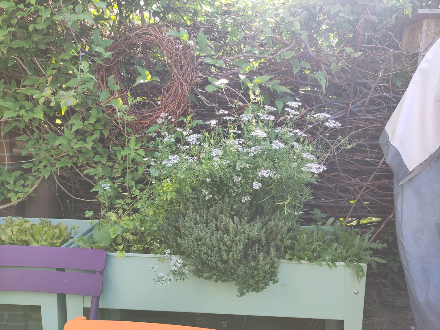 Dahinter befindet sich ein Hochbeet, in dem Aufgrund der vielen Nacktschnecken nicht so recht etwas wachsen will. Derzeit kämpfen ein Kürbis und Kohlrabis. Beschattet wird es von einer Korkenzieher-Weide, die schon bei unserem Einzug da war. Wir haben sie zur Kopfweide geschnitten und haben seit vielen Jahren Moschusböcke und Hornissen an ihr beobachtet.